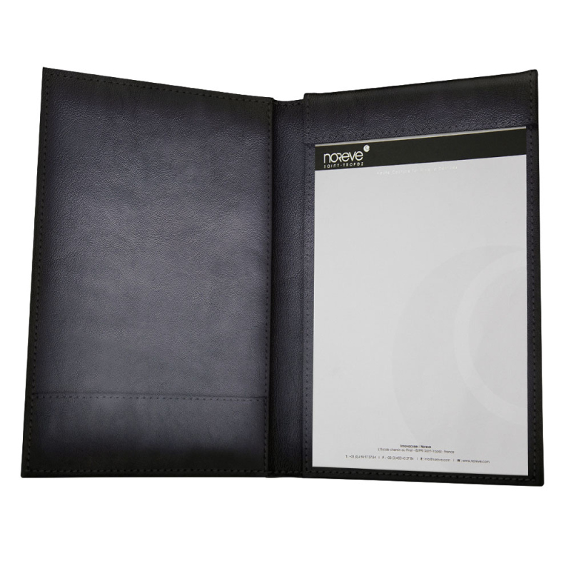 Este portador de facturas y cheques es ideal para hoteles, restaurantes o bares, y es a la vez sencillo y elegante. En él caben una factura, una tarjeta de visita, una tarjeta de crédito y/o billetes de forma segura y discreta.