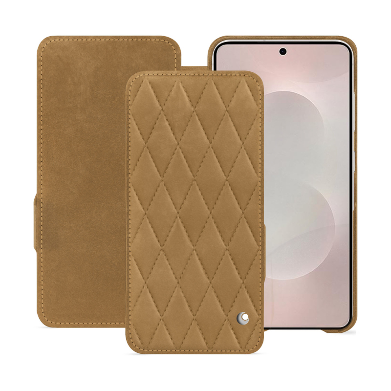 La custodia per Samsung Galaxy S26 Edge si distingue per un'esclusiva struttura interna, interamente rivestita in vera pelle o in alternative premium. Nessun silicone o plastica a vista: tutto è pensato per mantenere un'estetica pura, elegante e uniforme. La custodia si adatta perfettamente ai contorni specifici dell'S26 Edge, garantendo una tenuta impeccabile e un'ergonomia naturale.